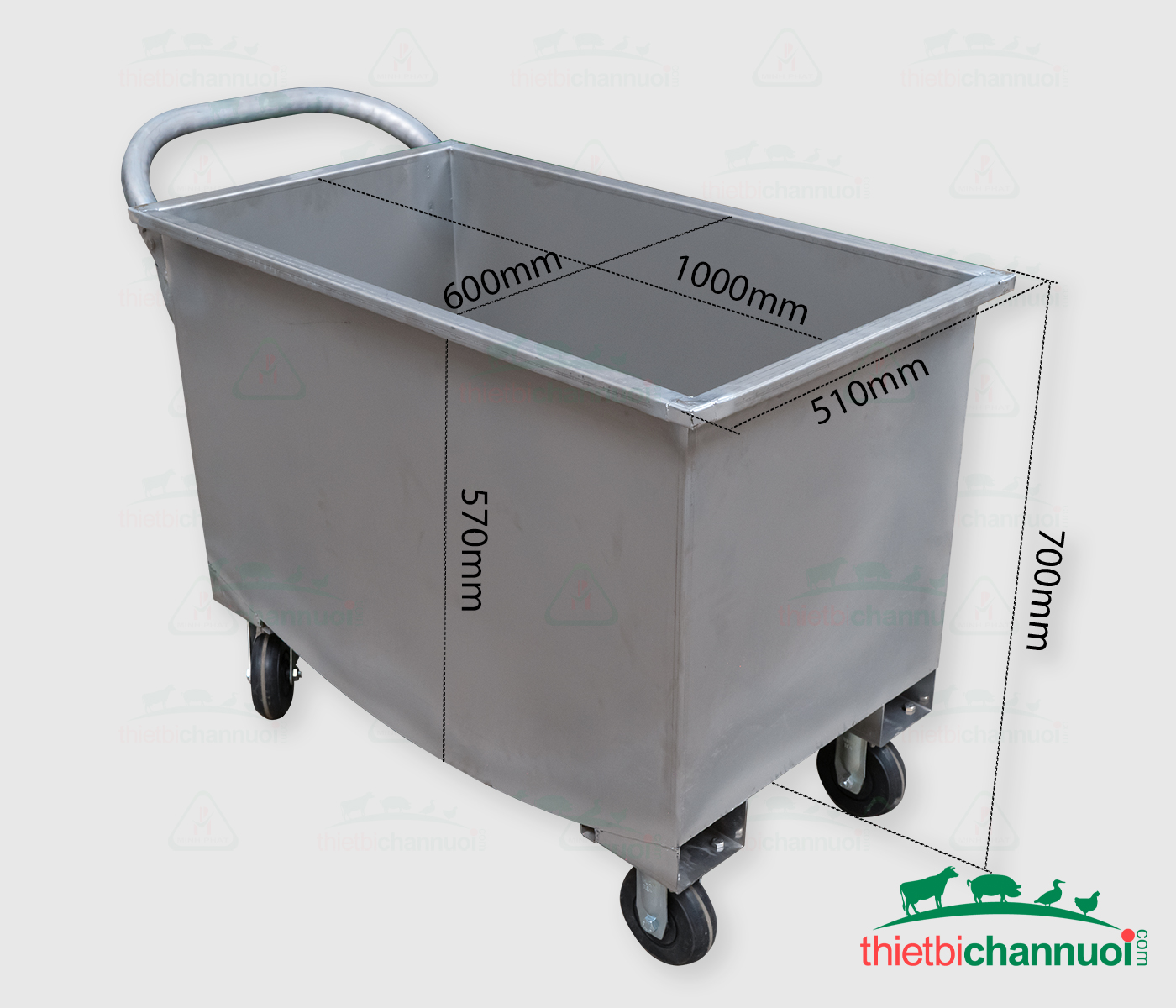 This product is specially designed for transporting and distributing feed to sow and piglet pens. It features 2 fixed front wheels and 2 rear wheels that rotate 360°.